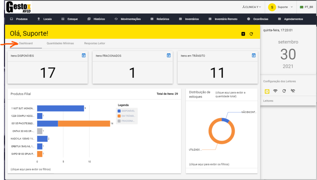 A tela inicial do sistema mostra a situação geral do estoque de forma fácil e clara, indicando tanto em forma de “Cards” como em forma de Gráficos as quantidades de itens da Filial da empresa selecionada.