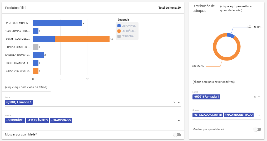 No caso da filial ter uma lista de itens monitorados (Produtos da Filial), ele mostra os quantitativos nos diversos Status selecionados, inclusive indicando que o item está com estoque zerado.