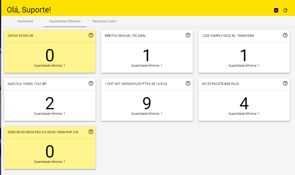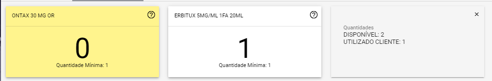 Vamos usar o primeiro Card como exemplo. Esse produto tem uma quantidade mínima definida como 1 unidades, e o estoque indica quantidade 0. Por estar abaixo da quantidade mínima o ”card” fica na cor amarela. Se o operador clicar no sinal de “?” do lado direito do “card”, vão aparecer informações sobre as quantidades desse item em outros status, por exemplo “EM TRÂNSITO”
