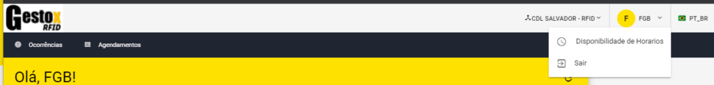 Para acessar a tela de organização da grade da localidade o usuário precisa acessar a opção “Disponibilidade de Horários” no menu drop-down abaixo do nome no canto superior direito da tela.