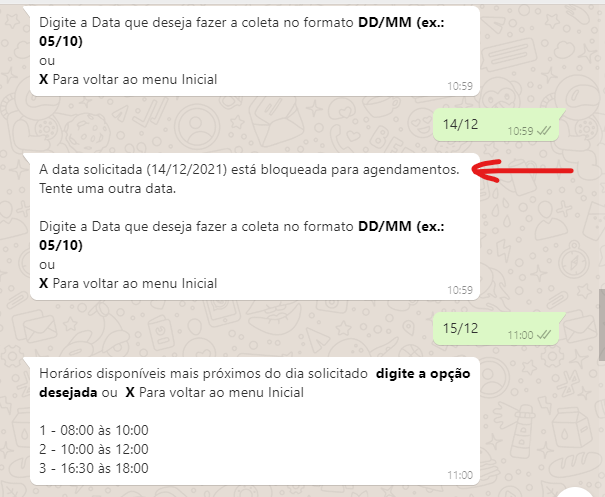 Agora olhando pelo lado do cliente fazendo o agendamento pelo Whatsapp, se ele selecionar uma data bloqueada, vai receber uma mensagem diferenciada.