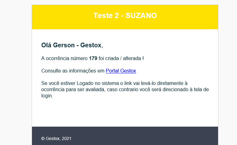 Na faixa amarela é apresentado o nome da Empresa (no caso do exemplo : Teste 2 – Suzano) e no corpo do email o nome do usuário cadastrado para receber os e-mails e o número da ocorrência.